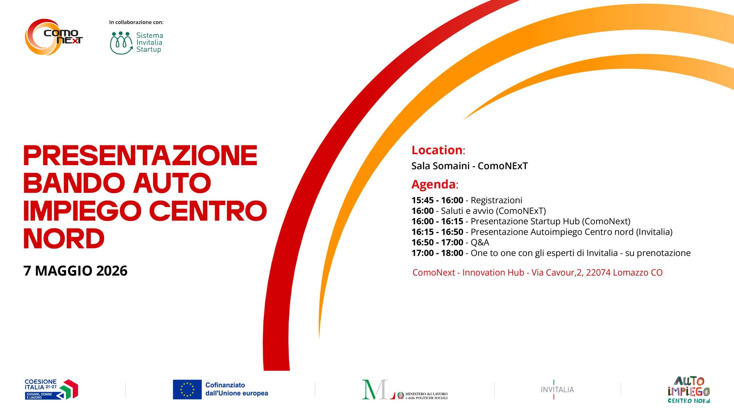 15:45 – 16:00 registrazione 16:00 – Saluti e avvio (ComoNExT) 16:00 – 16:15 Presentazione Startup Hub (ComoNext) 16:15 – 16:50 – Presentazione Autoimpiego Centro nord (Invitalia) 16:50 – 17:00 – Q&A 17:00 – 18:00 – One to one con gli esperti di Invitalia – su prenotazione Hai tra i 18 e i 35 anni e vuoi metterti in proprio? |